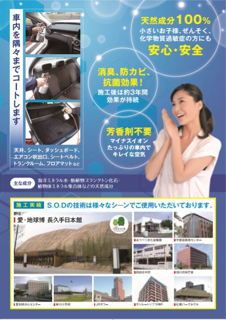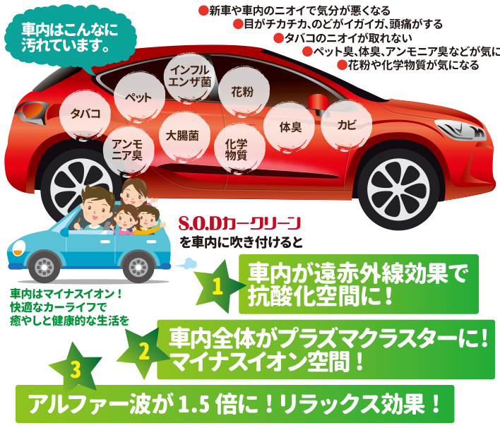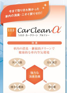 またSODカークリーンは消臭効果の他に、体臭・加齢臭・足臭・汚れ防止・抗菌・化学物質・インフルエンザ菌・大腸菌・花粉・ダニ・カビ菌など様々な効果を同時に得られます。